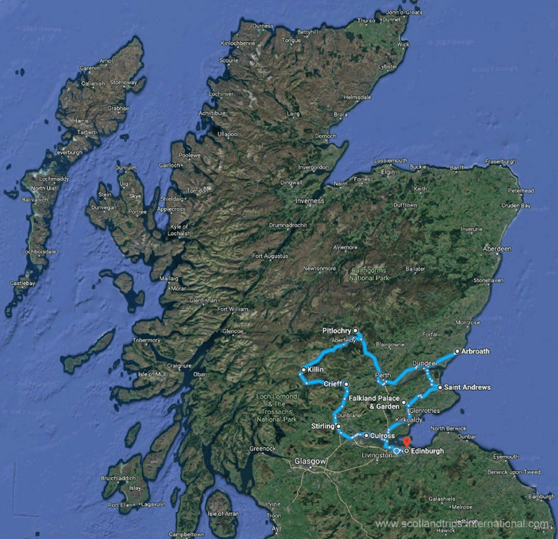 Edinburgh and the Lothians – Dundee & Angus – The Kingdom of Fife – The Forest of Loch Tay – The Fife Fishing Coast – Perthshire – St Andrews (the birthplace of Golf and Scotland).
